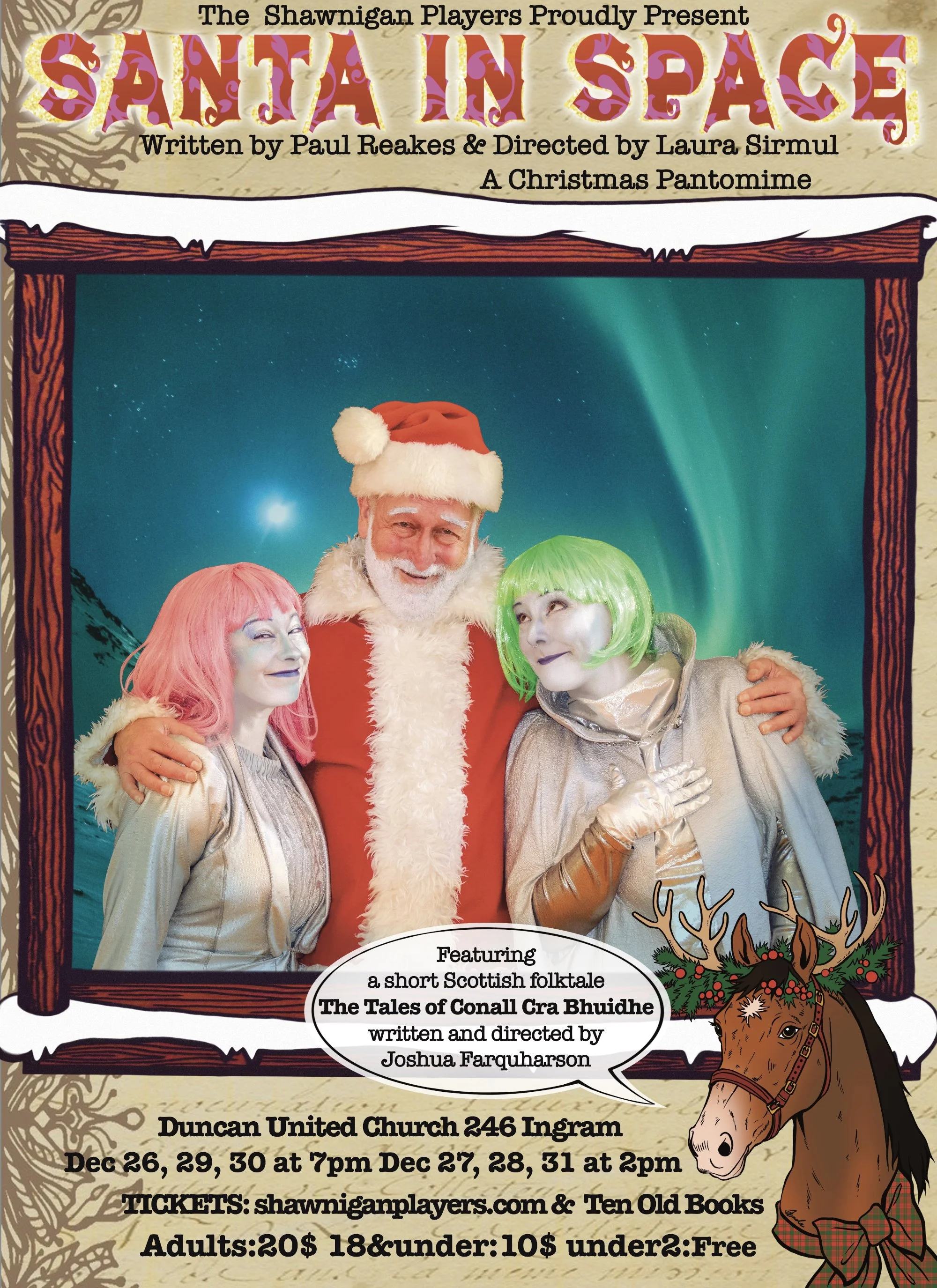 Come join the Shawnigan Players for this year‘s Christmas pantomime: Santa in Space written in 1985 by Paul Reakes; Directed by Laura Sirmul, produced by Bill Levity. Vileun the Vile, played by the iconic Alex Gallacher, desires to be the Supreme Master of the Universe. In order to achieve his aims, he decides that Santa (aka Atnas, the professor and crazy inventor played by the loveable Rob Foell) must be kidnapped as a way to get the Earthlings to go along with his dastardly evil plan. Our heroes: The Dame, played with epic comedic talent by Dan Leckey and Her, capital H! amazing entourage of the very young and small, PLUS a Robot! as well as the principal boy and the principal girl. They all rocket up to outer space to save him! What will happen in this mad cap adventure, full of sing-along, popular songs? Come and enjoy some escapist’s fantasy with colourful outrageous wackiness built in! Look forward to aliens and monsters, magic and mayhem. Fun for the whole family, from the very young to the very old.